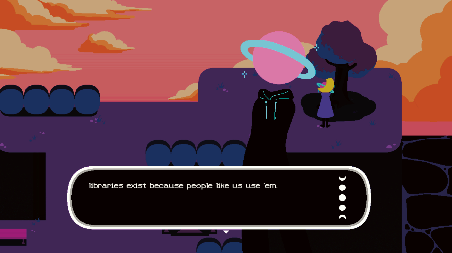LUNAR LIBRARY is a puzzle-and-narrative-focused CRPG where you play as an amnesiac librarian, learning about the world around you and yourself as well as your role, your work and your library as you go. Playtime is about 20 minutes.